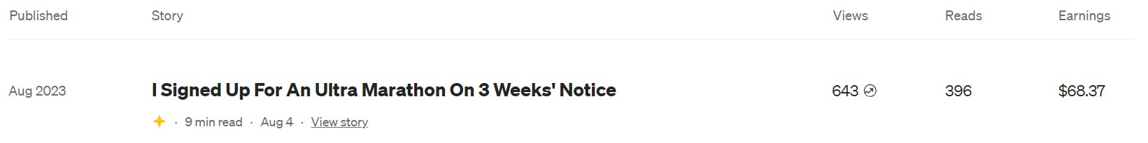 - Continue to grow this blog by becoming a better writer - Not a quantifiable goal however, I did get a post about the Run The Blades ultra boosted on Medium which meant it got sent out to more users and became my most viewed and earned post.